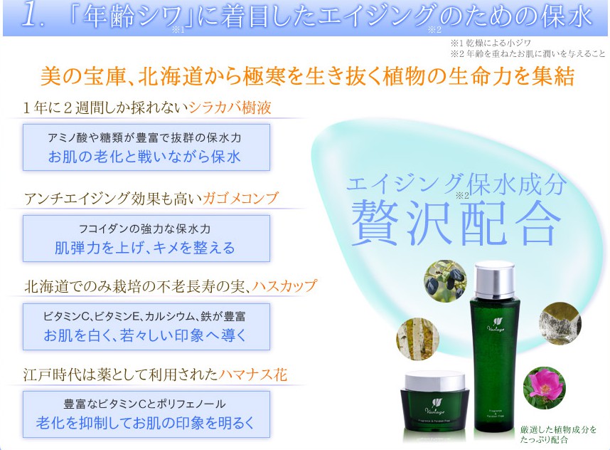 大自然の恵みエキスがエイジングケアを行う ヴァリアージュ 2013年03月23日 目元のエイジングケアを効果的に行う為に使えるというアイテムをご紹介しています。そこで注目しているのが『しわ面積減少を効能試験で評価』されたヴァリアージュです。このエイジングケアと保水機能の高さがこれら結果に結びついた訳なのですね~!そこで今回も前回に引き続きこのヴァリアージュの注目されている成分についてご紹介致します。さて今回は北海道という過酷な自然で生き抜く植物から採取した植物エキスから得られる恵みをふんだんにスキンケアに使われているというお話です。この含有されているエキスの元となる植物は以下の通りですが、(下図参照)これらは非常に高い保水性とエイジングケア機能を持っている訳です。特にシラカバ樹液は昨今スキンケアアイテムでも良く使われるようになったエキスでそれだけエイジングケア機能と保水に長けている植物なのです。しかも採取期間が一年でもほんの僅かな期間だけという事もあり「幻のエキス」とまで言われているそうです。有効な保水やエイジングケアを行う事で目元のシワやシミなどの年齢から来るお肌の悩みも解決出来るという事をこのヴァリアージュは証明しています。諦めないケアを行うという時におススメしたいのがこのヴァリアージュ。是非活用して見て下さい。