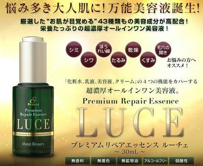 ルーチェで濃厚目元のエイジングケア ルーチェ 2013年06月06日 加齢によって起こるお肌のトラブルは幾つもありますね。それはシミだったりシワだったり。。はたまたキバミやくすみだったり。。そういったお肌のお悩みをトータルでケアしたいという方に今注目されている美容液があるのです。それが「プレミアムエッセンス ルーチェ」なのです。このルーチェはトータルエイジングケア美容液と言えるその秘密とはまさにその配合されている美容成分にあるでしょう。そしてその美容成分の数はなんと43種類!保湿からお肌の再生機能補助など色々なケアがこれ一つで出来てしまう訳なのです。まさにこれは目元のエイジングケアに持って来いな美容液なんですね~!そんな濃厚なルーチェのエイジングケアを是非体験してみてください~!詳細は下記より